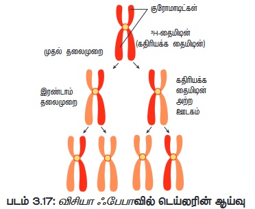 2. இரண்டாம் தலைமுறை குரோமோசோமின் இரு குரோமாடிட்களில் ஒன்றில் மட்டும் தான் கதிரியக்கக் குறியீடு காணப்பட்டது.