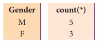 இரண்டு முடிவுகள் மட்டுமே திரும்ப பெறப்பட்டுள்ளது என்பதை கருத்தில் கொள்ளவும். இதன் காரணம் என்னவெனில், நாம் ஆண் மற்றும் 'பெண்' என்ற இரு பாலினங்களையே பெற்றுள்ளோம். GROUP BY clause அனைத்து 'M' மாணவர்களையும் தொகுத்து, ஒரு வரிசையை மட்டும் வெளியிட்டுள்ளது. இது போன்றே F’ மாணவர்களுக்கும் வெளியீடு அமையும்.