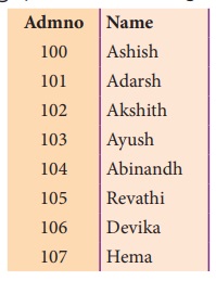 உதாரணமாக மாணவர் அட்டவணையில் இருந்து சேர்க்கை எண் மற்றும் மாணவர்களின் பெயரை மட்டுமே பார்க்க, கட்டளை பின்வருமாறு கொடுக்கப்பட்டுள்ளது: