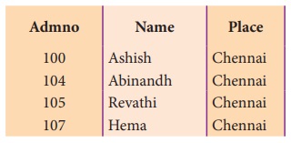 SELECT Admno, Name, Place FROM Student WHERE Place =”Chennai”;