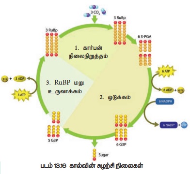 கால்வினுக்கு இதற்காக நோபல் பரிசு 1961-ஆம் ஆண்டு வழங்கப்பட்டது. மேலும் எனவே இந்தக் கார்பன் வழித்தடமானது கண்டறிந்தவர்களின் பெயரால் கால்வின்- பென்சன் சுழற்சி என அழைக்கப்படுகிறது. இருள்வினையாது வெப்பத்தினால் கட்டுப்படக்கூடியது. எனவே இது வெப்ப வேதியியல் வினை என்றும் அழைக்கப்படுகிறது. இருள் வினை மூன்று நிலைகளைக் கொண்டது (படம் 13.16).