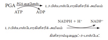 1, 3 பிஸ்பாஸ்போகிளிசரிக் அமிலமானது ஒடுக்கும் ஆற்றல் கூறான NADPH + H+ - ஐபயன்படுத்தி ஒடுக்கம் அடைந்து கிளிசரால்டிஹைடு 3 -பாஸ்பேட்டானது (G-3-P) உருவாகிறது. கிளிசரால்டிஹைடு 3 பாஸ்பேட் அதன் மாற்றியங்களில் ஒன்றான டைஹைட்ராக்ஸி அசிட்டோன் பாஸ்பேட்டாக மாறுகிறது (DHAP).