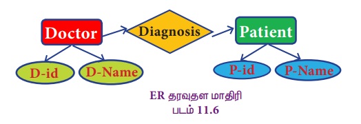 Doctor, Patient நீள்வட்டம் பண்புக் கூறுகளைக் குறிக்கிறது. எடுத்துக்காட்டாக D-id, D-Name, P-id, P-Name பண்புக்கூறுகள்