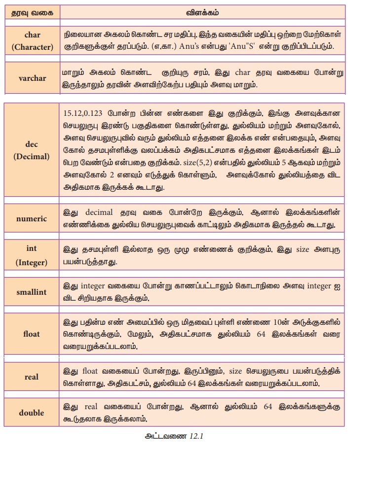 வினவல் அமைப்பு மொழி - தரவு வகைகள் | 12th Computer Science : Chapter 12 : Database concepts and MySql : Structured Query Language(SQL)