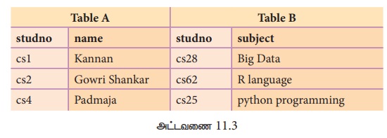 tuples களை மட்டும் தருகிறது. B அட்டவணையைத் தவிர்க்கிறது. A பண்புக்கூறின் பெயர்