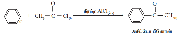 vi) நீரற்ற AIC13 முன்னிலையில் பென்சீன் மூலக்கூறு எத்தனாயில் குளோரைடுடன் வினைப்பட்டு அசிட்டோ பீனோனை உருவாக்கும் வினை.