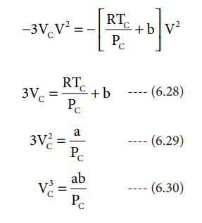 இச்சமன்பாடானது (6.26) Vல் அமைந்த முப்படிச் சமன்பாடாகும். இச்சமன்பாட்டினைத் தீர்க்கும் போது நாம் மூன்று தீர்வுகளைப் பெறலாம். நிலைமாறு நிலையில் Vன் இம்மூன்று மதிப்புகளும் நிலைமாறு கனஅளவு VCக்குச் சமம். மேலும் அழுத்தம் மற்றும் வெப்பநிலைகள் PC மற்றும் TC.க்குச் சமம்.