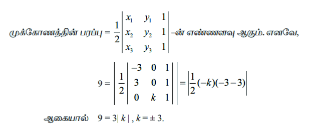 (− 3, 0), (3, 0), (0, k) என்ற உச்சிப்புள்ளிகளைக் கொண்ட முக்கோணத்தின் பரப்பு 9 சதுர அலகுகள் எனில், k −ன் மதிப்பைக் காண்க.