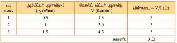 * மின்தடைமாற்றியில் மாற்றம் செய்து அம்மீட்டரில் 0.5 ஆம்பியர், 1.0 ஆம்பியர், 1.5 ஆம்பியர் மின்னோட்டங்களை பாயச் செய்யவும்.
