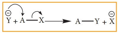 இங்குY- என்பது உள்வரும் கருக்கவர் பொருளைக் குறிப்பிடுகிறது மேலும் X- என்பது வெளியேறும் தொகுதியினைக் குறிப்பிடுகின்றது.