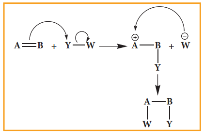 ஒரு பொதுவான எலக்ட்ரான்கவர் பொருள் சேர்க்கை வினையினை பின்வருமாறு குறிப்பிடலாம்.