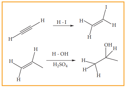 ஆல்கீன்கள் புரோமினேற்றம் அடைந்து புரோமோ ஆல்கேன்களைத் தரும் வினை இவ்வகை வினைக்கான ஒரு எடுத்துக்காட்டாகும்.