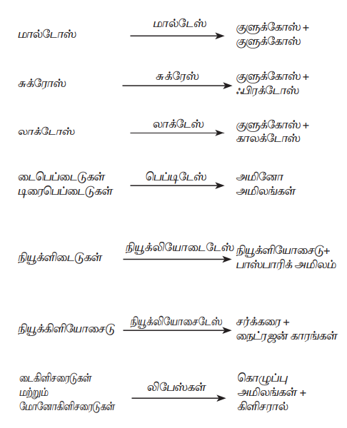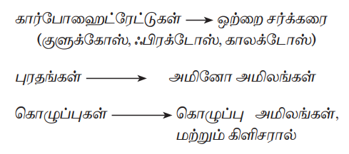 கார்போஹைட்ரேட்டுகள் → ஒற்றை சர்க்கரை (குளுக்கோஸ், ஃபிரக்டோஸ், காலக்டோஸ்)