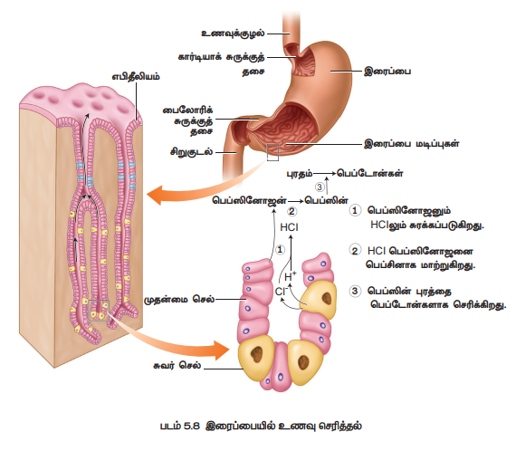 செயல்படாத முன்னொதியான பெப்ஸினோஜனை, செயல்படும் நொதியான பெப்ஸினாக ஹைட்ரோகுளோரிக் அமிலம் (HCI) மாற்றுகிறது. பெப்ஸின் (Pepsin) உணவிலுள்ள புரதத்தைப் புரோடியோஸ்களாகவும் பெப்டோன்களாகவும் (பெப்டைடுகள்) மாற்றுகிறது. ஹைட்ரோ குளோரிக் அமிலம் உணவை அமிலத்தன்மை (pH 1.8) யுடன் இருக்கச் செய்து பெப்சின் செயல்பாட்டிற்கு உகந்த நிலையை அளிப்பதுடன் கேடு விளைவிக்கும் பாக்டீரியா மற்றும் பிற கிருமிகளை அழித்துஉணவுஅழுகுதலையும் தடுக்கின்றது. இரைப்பை நீரில் உள்ள கோழை மற்றும் பைகார்பனேட்டுகள் உயவுப்பொருளாகி, அதிக அமிலத்தன்மையுடைய HCI பாதிப்பிலிருந்தும் இரைப்பையின் கோழைப் படல எபிதீலியத்தை பாதுகாக்கின்றன (படம் 5.8). ரென்னின் (Rennin) என்னும் மற்றுமொரு புரதநொதி இளங்குழந்தைகளின் இரைப்பைநீரில் உள்ளது. இது கால்சியம் அயனிகளின் முன்னிலையில் பால் புரதமான காசினோஜனை காசினாக மாற்றுகிறது. வயது அதிகரிக்கையில், இந்த நொதியின் அளவு குறைகிறது.