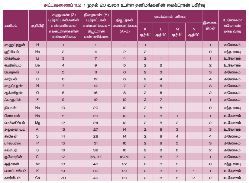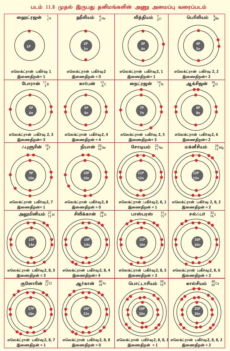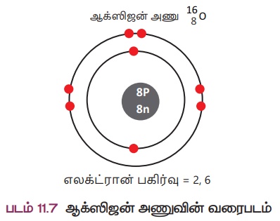 மேலே உள்ள எடுத்துக்காட்டில் (படம் 11.7), ஆக்சிஜன் அணுவின் வெளிவட்ட ஆர்பிட்டில் ஆறு எலக்ட்ரான்கள் உள்ளன என்பதை நாம் காணலாம். இந்த ஆறு எலக்ட்ரான்கள் இணைதிறன் எலக்ட்ரான்கள் என அழைக்கப்படுகின்றன.