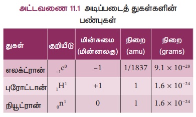 எலக்ட்ரான், புரோட்டான் மற்றும் நியூட்ரான் ஆகிய மூன்று அடிப்படைத் துகள்களும் அணுவின் அமைப்பினைப் புரிந்து கொள்வதில் பெரும் பங்காற்றுகின்றன. அவற்றின் பண்புகள் கீழே அட்டவணைப் படுத்தப்பட்டுள்ளன.