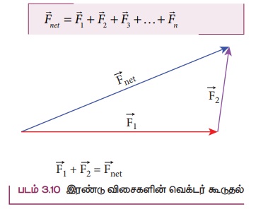 net ) தனித்தனி விசைகளின் வெக்டர் கூடுதலுக்குச் சமமாகும். அந்த நிகர விசை (