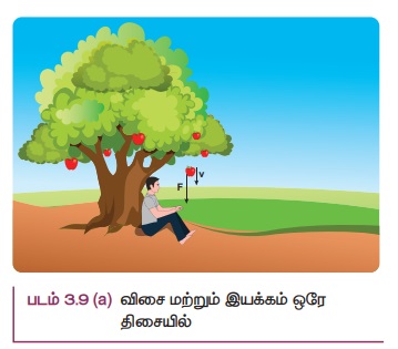 ஆப்பிள், புவியினை நோக்கி விழும்போது ஆப்பிளின் இயக்கத் திசையும் (திசை வேகமும்), ஆப்பிளின் மீது செயல்படும் புவிஈர்ப்பு விசையும் ஒரே கீழ்நோக்கிய திசையில் அமைந்துள்ளது. இது படம் 3.9 (a) இல் காட்டப்பட்டுள்ளது.