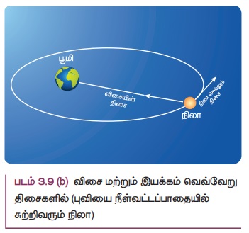 நிலா புவியினை நோக்கி ஒரு விசையை உணர்கிறது ஆனால், நிலா புவியை ஒரு நீள்வட்டப்பாதையில் சுற்றி வருகிறது. இந்நிகழ்வில் இயக்கத்தின் திசை விசையின் திசையிலிருந்து மாறுபட்டு உள்ளதை படம் 3.9 (b) யிலிருந்து அறியலாம்.