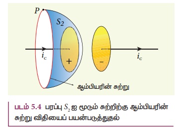 இப்போது அதே சுற்று பலூன் வடிவம் கொண்ட பரப்பு S2வினால் மூடப்பட்டுள்ளது (படம் 5.4). அதாவது S1 மற்றும் S2 இரண்டு பரப்புகளின் எல்லைகளுமே ஒன்றாக இருந்தாலும், அப்பரப்புகளின் வடிவம் வெவ்வேறாக உள்ளது. ஒரு மூடப்பட்ட சுற்றுக்கு ஆம்பியர் விதியைப் பயன்படுத்தும்போது, அது சூழும் பரப்பினுடைய வடிவத்தைப் பொறுத்து அமையாது என்பதால் இரு தொகையீடுகளும் ஒரே மதிப்பைத் தர வேண்டும். ஆனால் பரப்பு S2க்கு ஆம்பியரின் சுற்று விதியைப் பயன்படுத்தினால்,