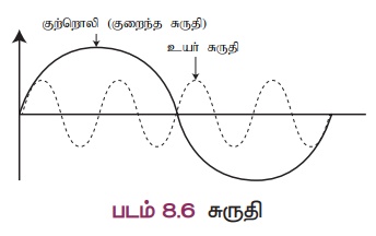 சுருதி என்பது ஒரு ஒலியானது கனத்ததா அல்லது கீச்சலானதா என்பதை அறிய உதவும் ஒலியின் பண்பாகும். அதிக சுருதி கொண்ட ஒலிகள்கீச்சலாகவும், குறைந்த சுருதி கொண்ட ஒலிகள் கனத்ததாகவும் இருக்கும். இரண்டு இசைக் கருவிகளால் எழுப்பப்படும் ஒரே வீச்சைக் கொண்ட இரண்டு ஒலிகள் வேறுபட்ட அதிவெண்களைக் கொண்டிருந்தால், அவை ஒன்றுக் கொன்று வேறுபடுகின்றன. குறைந்த சுருதி மற்றும் அதிக சுருதி கொண்ட இரண்டு ஒலிகளைக் குறிக்கும் அலைகள் படம் 2.7 ல் காட்டப்பட்டுள்ளன.