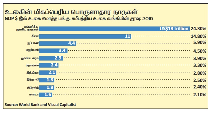 உலக வங்கியின் சமீபத்திய புள்ளி விவரத்தின்படி அமெரிக்க ஐக்கிய நாடுகள் தான் பொருளாதாரத்தில் உலகின் மிகப்பெரிய நாடு. 18 ட்ரில்லியன் அமெரிக்க டாலர்களுடன் உலகப் பொருளாதாரத்தின் கால்பங்கு இடத்தை அது பெற்றுள்ளது (24.3%). அதனைத் தொடர்ந்து சீனா 11 ட்ரில்லியன் டாலர்களுடன் இரண்டாம் இடத்தை வகிக்கிறது (14.8%). ஜப்பான் 4.4 ட்ரில்லியன் டாலருடன் (6%) மூன்றாவது இடத்தை பெற்றுள்ளது. அடுத்ததாக ஜெர்மனி 3.3 ட்ரில்லியன் டாலருடன் நான்காம் இடத்தைக் கொண்டுள்ளது. ஐக்கிய அரசு 2.9 ட்ரில்லியன் டாலருடன் ஐந்தாம் இடத்தையும் பிரான்சு 2.4 ட்ரில்லியனுடன் ஆறாம் இடத்தையும் வகிக்கிறது. இந்தியா 2.1 ட்ரில்லியன் தொகையுடன் ஏழாம் இடத்தையும், இத்தாலி 1.8 ட்ரில்லியன் தொகையுடன் எட்டாம் இடத்தையும், 1.8 ட்ரில்லியனுக்கு சற்று குறைவாக பெற்று பிரேசில் ஒன்பதாம் இடத்தையும் 1.5 ட்ரில்லியன் டாலருடன் கனடா பத்தாம் இடத்தையும் வகிக்கிறது. அமெரிக்க ஐக்கிய நாட்டின் பொருளாதாரநிலை மூன்றாம் இடம் முதல் பத்தாம் இடம் வரை காணப்படும். நாடுகளின் பொருளாதார நிலையின் கூடுதலைவிட அதிகமாக உள்ளது.