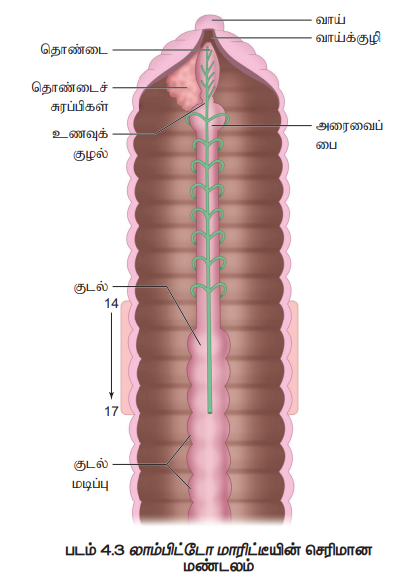 புறத்தோற்றம் (Morphology), உள்ளுறுப்பு அமைப்பு , செரிமான மண்டலம், சுவாச மண்டலம், இரத்த ஓட்ட மண்டலம், நரம்பு மண்டலம், கழிவு நீக்க மண்டலம், இனப்பெருக்க மண்டலம், வாழ்க்கை சுழற்சி - மண்புழு - லாம்பிட்டோ மாரிட்டீ | 11th Zoology : Chapter 4 : Organ and Organ Systems in Animals