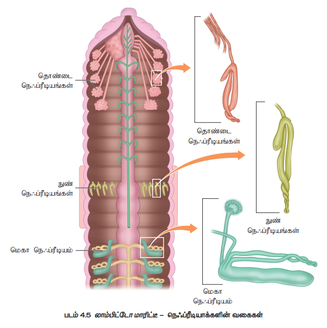 ஆ. நுண் நெஃப்ரீடியா (அல்லது) தோல் நெஃப்ரீடியா (Micronephridia or Integumentary nephridia) - 14 வது கண்டம் முதல் உடலின் கடைசி கண்டம் வரையுள்ள இந்த நெஃப்ரீடியா, உடல் சுவரோடு இணைக்கப்பட்டுள்ளது. உடல் பரப்பின் மேல் இவை திறக்கின்றன.
