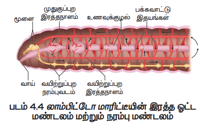 லாம்பிட்டோ மாரிட்டீயில், மூடியவகை இரத்த ஓட்ட மண்டலம் உள்ளது. இம்மண்டலத்தில், இரத்த நாளங்கள், இரத்த நுண் நாளங்கள் மற்றும் பக்கவாட்டு இதயங்கள் ஆகியவை அடங்கியுள்ளன (படம்.4.4). இரண்டு பெரிய மைய இரத்த நாளங்கள் உணவுக்குழலின் மேலும், கீழும் உடல் நீளத்திற்கும் செல்கின்றன. அவை முறையே முதுகுப்புற இரத்தநாளம், வயிற்றுப் புற இரத்தநாளம் என்று அழைக்கப்படுகின்றன. முதுகுப்புற இரத்த நாளத்தில் உள்ள ஓர் இணை வால்வுகள் பின்னோக்கிய இரத்த ஓட்டத்தைத் தடுக்க உதவுகிறது. வயிற்றுப் புற இரத்தநாளத்தில் வால்வுகள் இல்லை. இந்நாளம் சுருங்கி விரியும் தன்மையற்றது. ஆதலால் இரத்தம் பின்னோக்கிச் செல்கிறது.