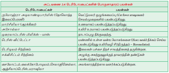 டெரிடோஃபைட்களின் பொருளாதார முக்கியத்துவம் அட்டவணை 2.3-ல் கொடுக்கப்பட்டுள்ளது.
