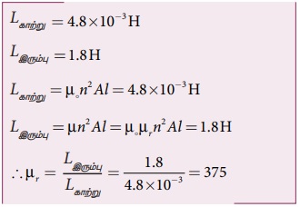 காற்று உள்ளகம் கொண்ட ஒரு வரிச்சுருளின் தன் மின்தூண்டல் எண் 4.8mH ஆகும். அதன் உள்ளகம், இரும்பு உள்ளகமாக மாற்றப்பட்டால் அதன் தன் மின்தூண்டல் எண் 1.8H ஆக மாறுகிறது. இரும்பின் ஒப்புமை உட்புகுத்திறனைக் கணக்கிடுக.