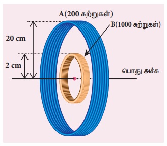 படத்தில் காட்டியுள்ளவாறு, இரண்டு ஒரு-தள, பொது- அச்சு கொண்ட வட்ட கம்பிச்சுருள்கள் A மற்றும் B-ஐக் கருதுக. கம்பிச்சுருள் A-இன் ஆரம் 20 cm மற்றும் கம்பிச்சுருள் B-இன் ஆரம் 2 cm ஆகும். கம்பிச்சுருள்கள் A மற்றும் B-இல் உள்ள சுற்றுகள் முறையே 200 மற்றும் 1000 ஆகும். கம்பிச்சுருள்கள் இடையேயான பரிமாற்றுமின்தூண்டல் எண்ணைக் கணக்கிடுக. கம்பிச்சுருள் A-இல் உள்ள மின்னோட்டம் 2 A இல் இருந்து 6 A ஆக 0.04 விநாடியில் மாறினால், கம்பிச்சுருள் B-இல் தூண்டப்பட்ட மின்னியக்கு விசை மற்றும் அந்தக் கணத்தில் கம்பிச்சுருள் B வழியேயான காந்தப்பாயம் மாறும் வீதம் ஆகியவற்றைக் கணக்கிடுக.