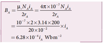 கம்பிச்சுருள் A-இல் பாயும் மின்னோட்டம் iA என்க. வட்ட கம்பிச்சுருள் A-இன் மையத்தில் உள்ள காந்தப்புலம் BA ஆனது