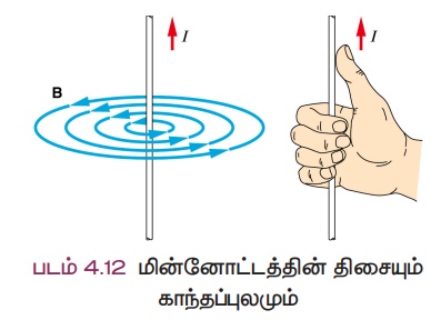 மின்னோட்டத்தின் திசை வலதுகை கட்டை விரலினால் காண்பிக்கப்படுகிறது. படம் 4.12-ல் உள்ளவாறு மின்னோட்டத்தின் திசை வலதுகை கட்டைவிரலின் திசையிலும் காந்தப்புலத்தின் திசை வலதுகையின் மற்ற விரல்களின் திசையிலும் இருக்கும்.