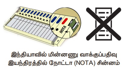 - Nane Of The Above) எனும் ஓர் பொத்தானை வாக்கு இயந்திரத்தில் தேர்வு செய்யலாம். இந்திய தேர்தல் நடத்தை விதிகள்,
