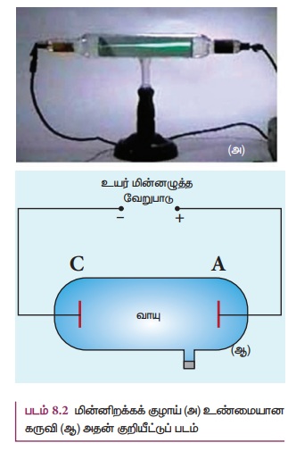 ஆராய உதவும் எளிய கருவியே மின்னிறக்கக் குழாய் ஆகும். அதன் அமைப்பு படம் 8.2ல் காட்டப்பட்டுள்ளது.