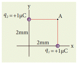 படத்தில் கொடுக்கப்பட்டுள்ள புள்ளி மின்துகள் அமைப்பைக் கருதவும். புள்ளி A ல் உருவாகும் மின்புலத்தைக் கணக்கிடுக. அப்புள்ளியில் எலக்ட்ரான் ஒன்று வைக்கப்பட்டால், அது அடையும் முடுக்கம் எவ்வளவு? (எலக்ட்ரானின் நிறை = 9.1 X 10-31 kg, எலக்ட்ரானின் மின்னூட்டம் = -1.6X 10-19C)