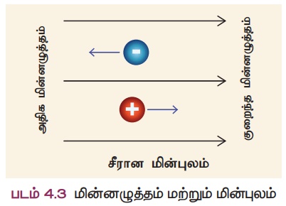 எதிர் மின்னூட்டம் ஒன்று மின் புலத்தின் திசைக்கு எதிராக விசையைப் பெறும்.