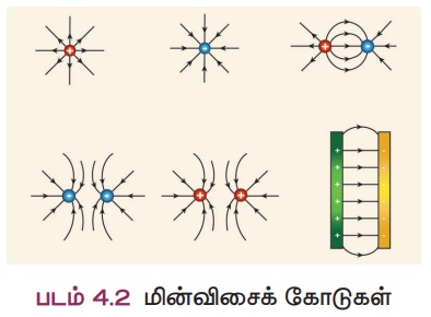 ஒரு மின்னூட்டத்தைச் சுற்றி அதன் மின்விசையை உணரக்கூடிய பகுதி மின்புலம் எனப்படும். மின்புலம் பெரும்பாலும் கோடுகளாலும் மின்புலத்தின் திசை அம்புக்குறிகளாலும் குறிக்கப்படுகின்றன (படம் 4.2).