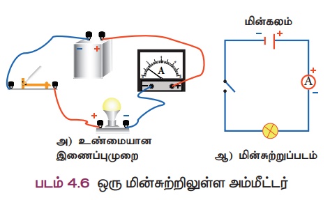 எந்த மின்சுற்றில் மின்னோட்டத்தை அளவிட வேண்டுமோ அதில் அம்மீட்டரை தொடரிணைப்பில் இணைக்க வேண்டும் (படம் 4.6).