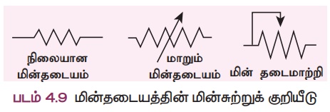 நிலையான மின்தடையங்கள் ஒரு குறிப்பிட்ட மாறா மதிப்புடைய மின்தடையைக் கொண்டிருக்கும். மாறும் மின்தடையங்களும் மின்தடை மாற்றிகளும் நமக்குத் தேவைப்படும் மதிப்புடைய மின்தடைகளைப் பெறும் வண்ணம் மாற்றியமைக்கக் கூடியதாக இருக்கும். (படம் 4.9)