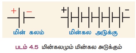 மின்சுற்றுப் படங்களில் நேர் மின்வாயை நீளமான கோட்டுத்துண்டினாலும் எதிர் மின்வாயை சிறிய கோட்டுத்துண்டினாலும் குறிப்பர். மின்கல அடுக்கு என்பது ஒன்றுக்கு மேற்பட்ட மின்கலங்களின் தொகுதியாகும் (படம் 4.5).