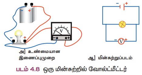மின்னழுத்த வேறுபாட்டை அளவிட உதவும் கருவி வோல்ட்மீட்டர் ஆகும். ஒரு கருவியின் குறுக்கே காணப்படும் மின்னழுத்த வேறுபாட்டை அளந்திட வோல்ட்மீட்டர் ஒன்றை அதற்கு பக்க இணைப்பாக இணைக்க வேண்டும். மின்விளக்கு ஒன்றின் மின்னழுத்த வேறுபாட்டை அளந்திட வேண்டுமெனில், படம் 4.8-இல் காட்டியுள்ளவாறு அதை இணைத்தல் வேண்டும்
