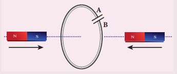 4. படத்தில் காட்டியுள்ளவாறு இரு சட்டக் காந்தங்கள் நகர்த்தப்பட்டால் மூடிய வட்டச் சுற்றில் உள்ள மின்தேக்கியின் முனைப்புத் தன்மையைக் கூறுக.