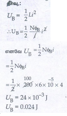10. 200 சுற்றுகள் கொண்ட ஒரு கம்பிச்சுருள் 4A மின்னோட்டத்தை கொண்டுள்ளது. கம்பிச்சுருள் வழியே செல்லும் காந்தப்பாயம் 6 × 10−5 Wb எனில், கம்பிச்சுருளைச் சுற்றியுள்ள ஊடகத்தில் சேமிக்கப்பட்ட காந்த ஆற்றலைக் கணக்கிடுக.