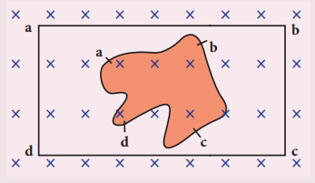 3. ஒரு சதுர வடிவில் உள்ள உலோகச் சுற்று abcd ஆனது வளையக்கூடியது. அதன் தளம் புலத்திற்கு குத்தாக உள்ளவாறு ஒரு காந்தப்புலத்தில் வைக்கப்பட்டுள்ளது. காந்தப்புலமானது தாளின் தளத்திற்கு குத்தாக உள்நோக்கி உள்ளது. படத்தில் காட்டியுள்ளவாறு சதுரச் சுற்று ஒரு ஒழுங்கற்ற வடிவத்திற்கு நசுக்கப்பட்டால் தூண்டப்பட்ட மின்னோட்டத்தின் திசையைக் காண்க.