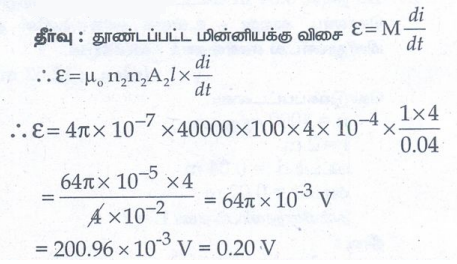 15. 2 cm ஆரம் மற்றும் 200 சுற்றுகள் கொண்ட வட்டவடிவ கம்பிச்சுருளானது 3 cm ஆரமுள்ள நீண்ட வரிச்சுருளுக்குள் பொது அச்சுள்ள வகையில் வைக்கப்பட்டுள்ளது. வரிச்சுருளின் சுற்று அடர்த்தி 90 சுற்றுகள் / செமீ எனில், சுருள் மற்றும் வரிச்சுருள் இடையிலான பரிமாற்று மின்தூண்டல் எண்ணைக் கணக்கிடுக.