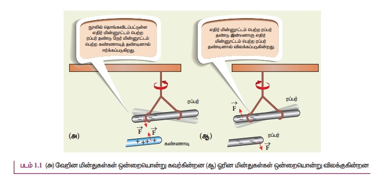விலக்குகின்றன எனலாம். மின்னூட்டம் பெற்ற கண்ணாடித் தண்டை மின்னூட்டம் பெற்ற இன்னொரு