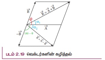வெக்டர்கள் எண்மதிப்பையும், திசையையும் பெற்றிருப்பதால் அவற்றை சாதாரண இயற்கணித விதிகளைப் பயன்படுத்திக் கழிக்க முடியாது. எனவே வெக்டர் கழித்தலை வடிவியல் முறை அல்லது பகுப்பு முறையில் காண வேண்டும். வடிவியல் முறையில் இரண்டு வெக்டர்களை எவ்வாறு கழிக்க வேண்டும் என்பது படம் 2.19 இல் காட்டப்பட்டுள்ளது.