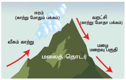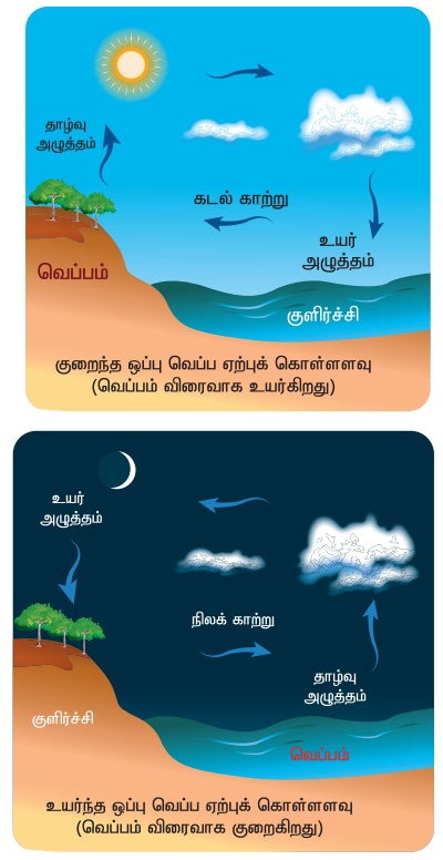 குளிர்ச்சியான இடத்திலிருந்து வீசும் காற்றுகள் ன் இடத்தைக் குளிர்ச்சியாகவும் வைக்கிறது கடலிலிருந்து நிலத்தை நோக்கி வீசும் காற்றுகள் மழைப் பொழிவைத் தருகின்றன. ஆனால் நிலத்திலிருந்து கடலை நோக்கி வீசும் காற்றுகள் வறட்சியான வானிலையை உருவாக்குகிறது.